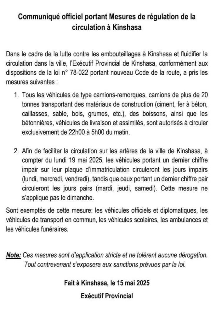 Ces mesures visent à apporter des solutions à court terme à la problématique chronique des embouteillages, qui affectent sérieusement la productivité et la qualité de vie des habitants de Kinshasa.